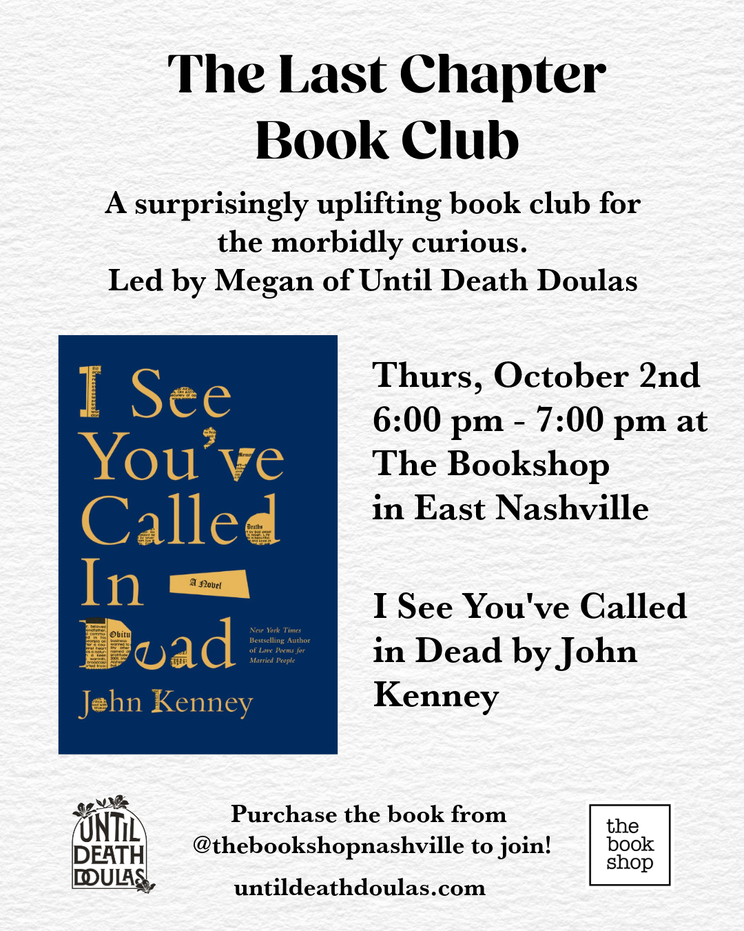 The Last Chapter Book Club - a surprisingly uplifting book club for the morbidly curious. Led by Megan Morano of Until Death Doulas.